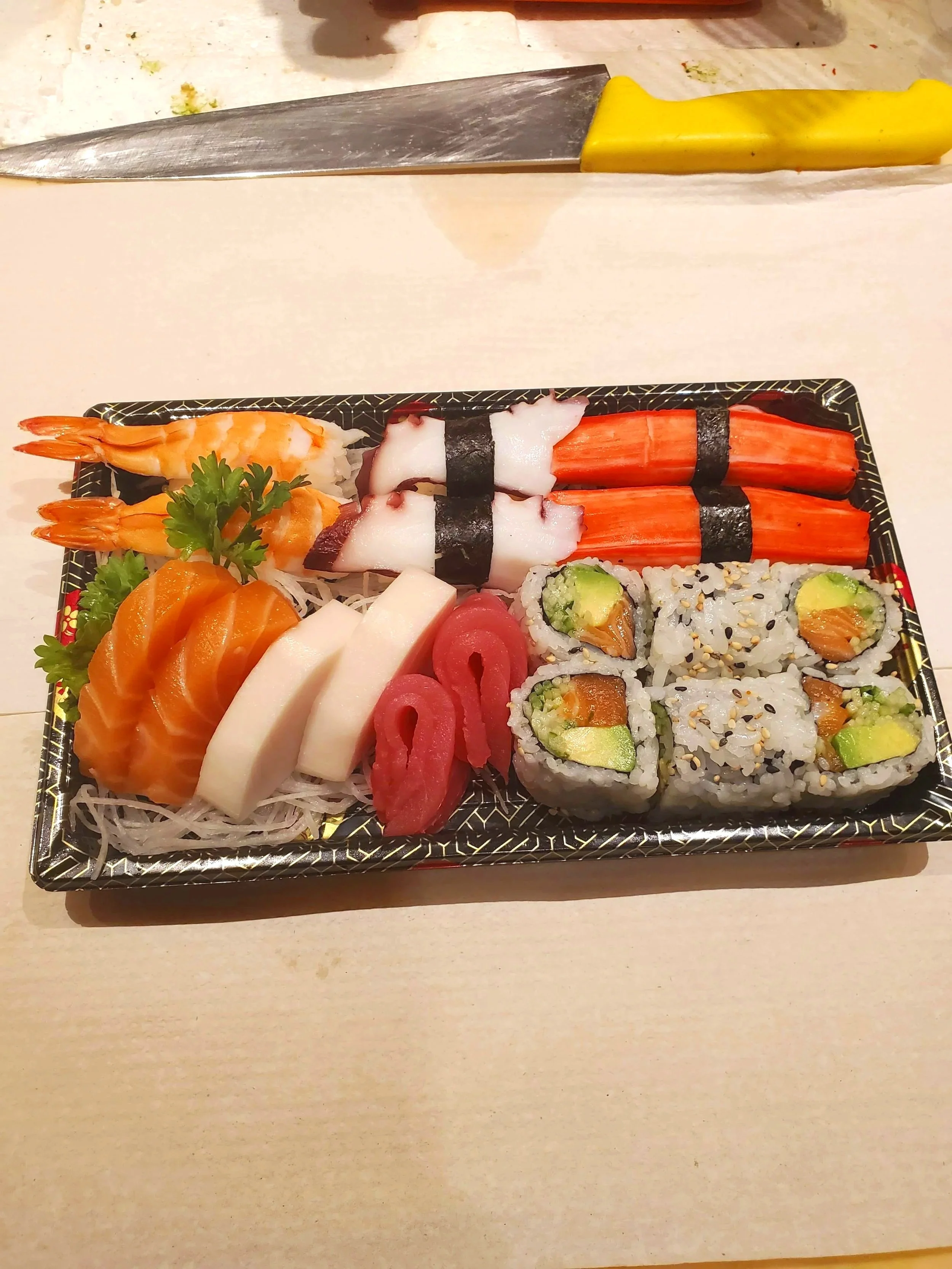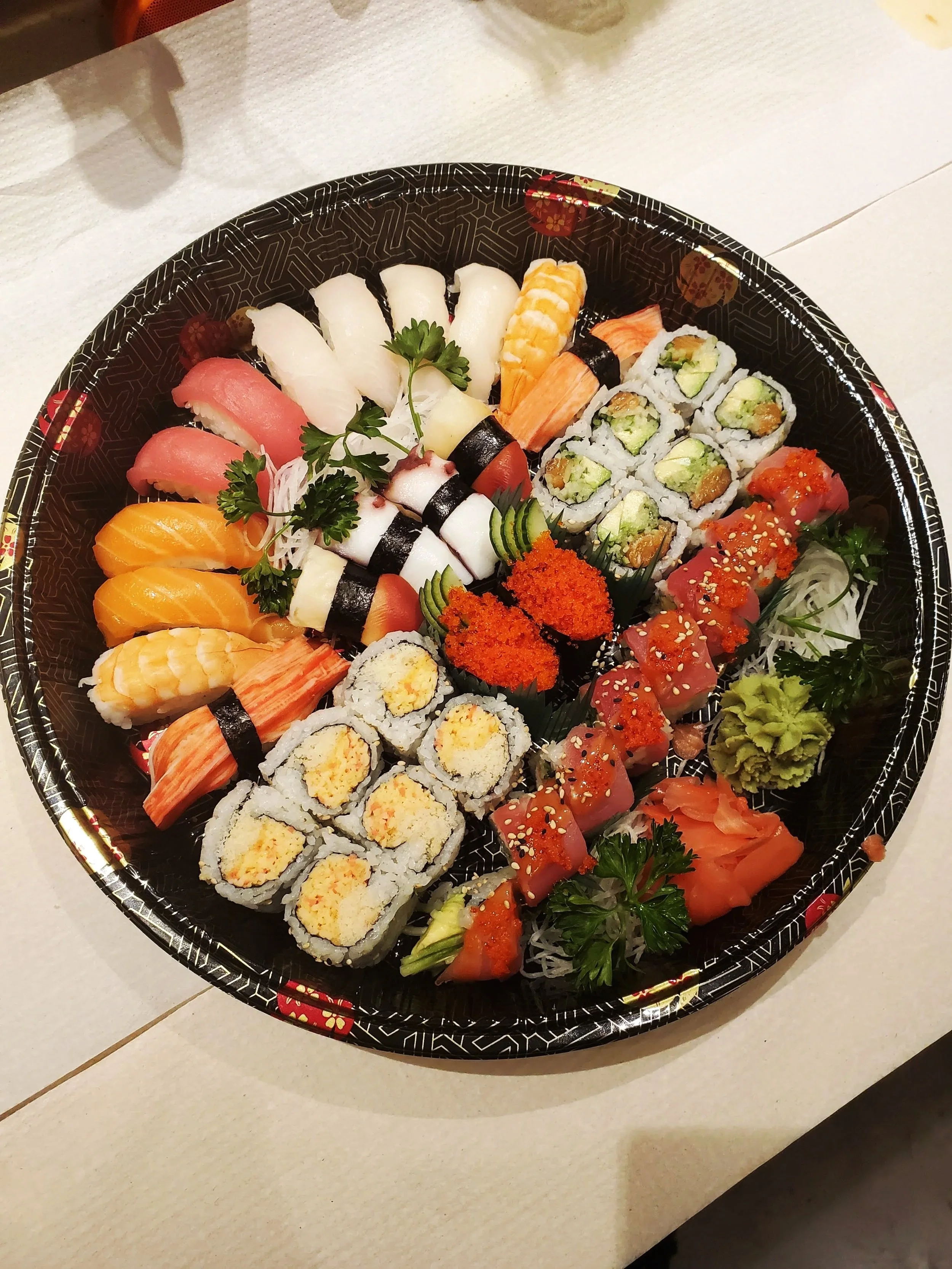 18pc Sushi, 18pc Sashimi, Spicy Tuna Roll, California Roll, Sunshine Roll, Rainbow Roll, Black Dragon Roll